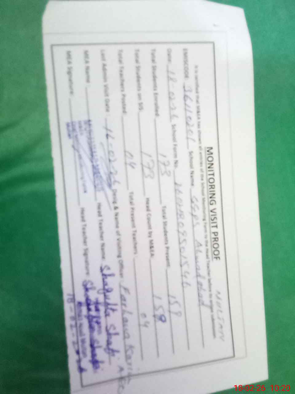 | Attendance Register | Head Teacher | MEA with School | Visit Proof |