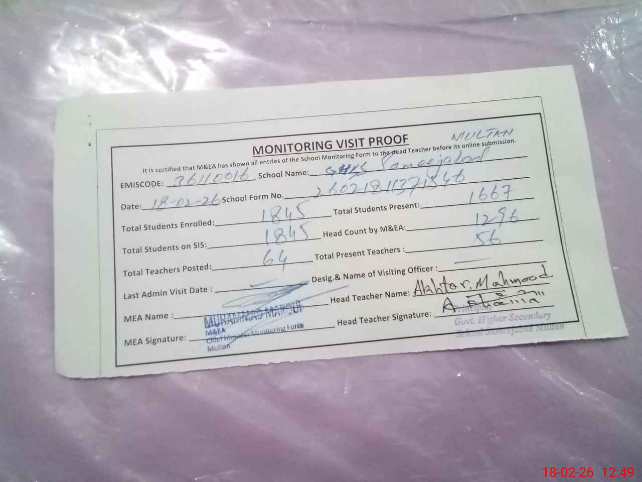 | Certified that this School was Inspected by the Undersigned MEA/DMO Today and the Information Stated Above is as Per Record. | |||||