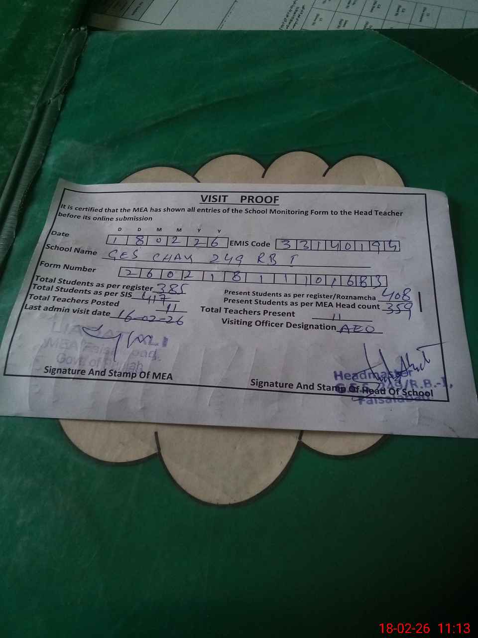 | EMIS Code: 33140194 | Name of School: GES CHAK 249 RB I | |||