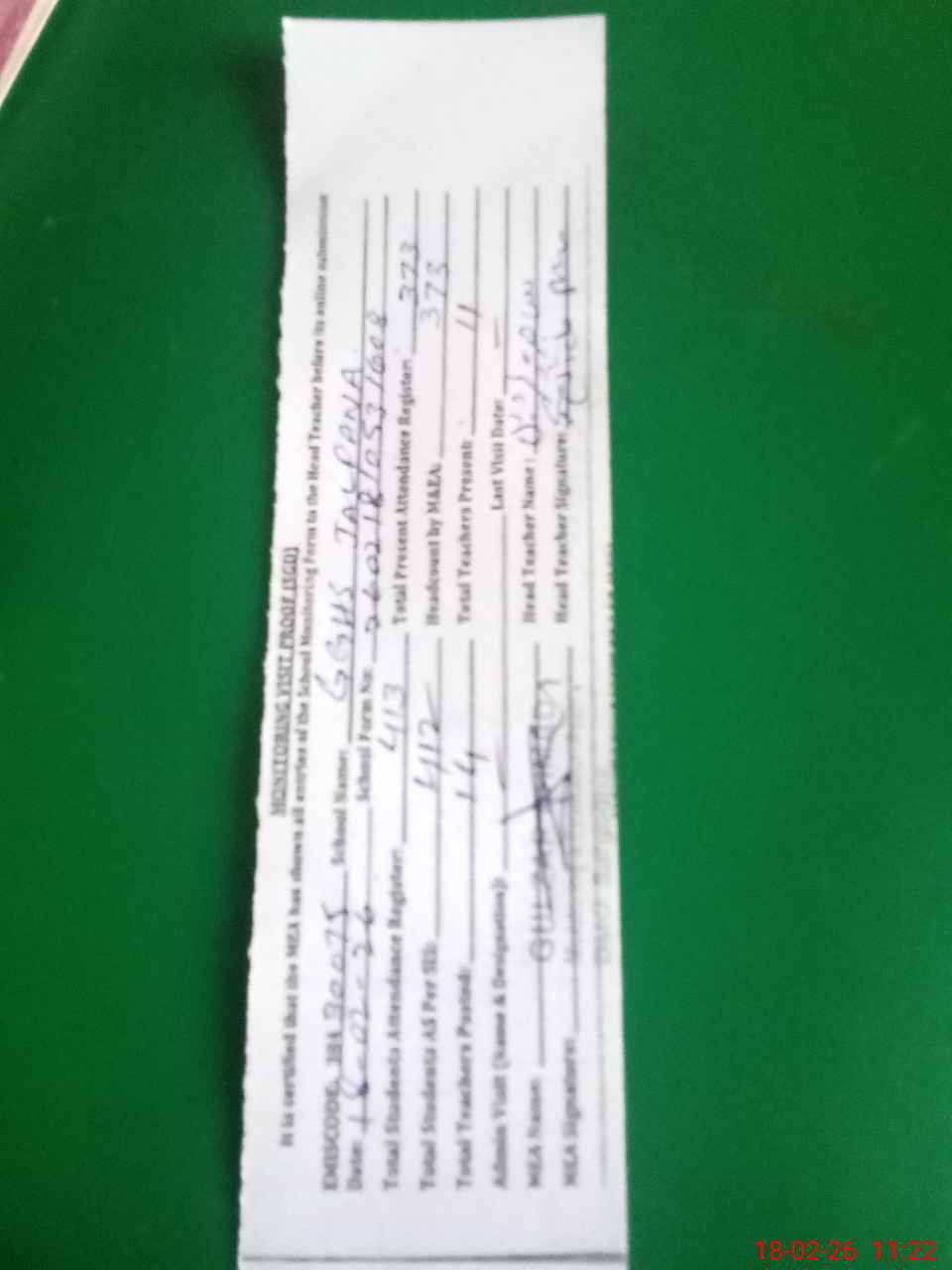 | Attendance Register | Head Teacher | MEA with School | Visit Proof |