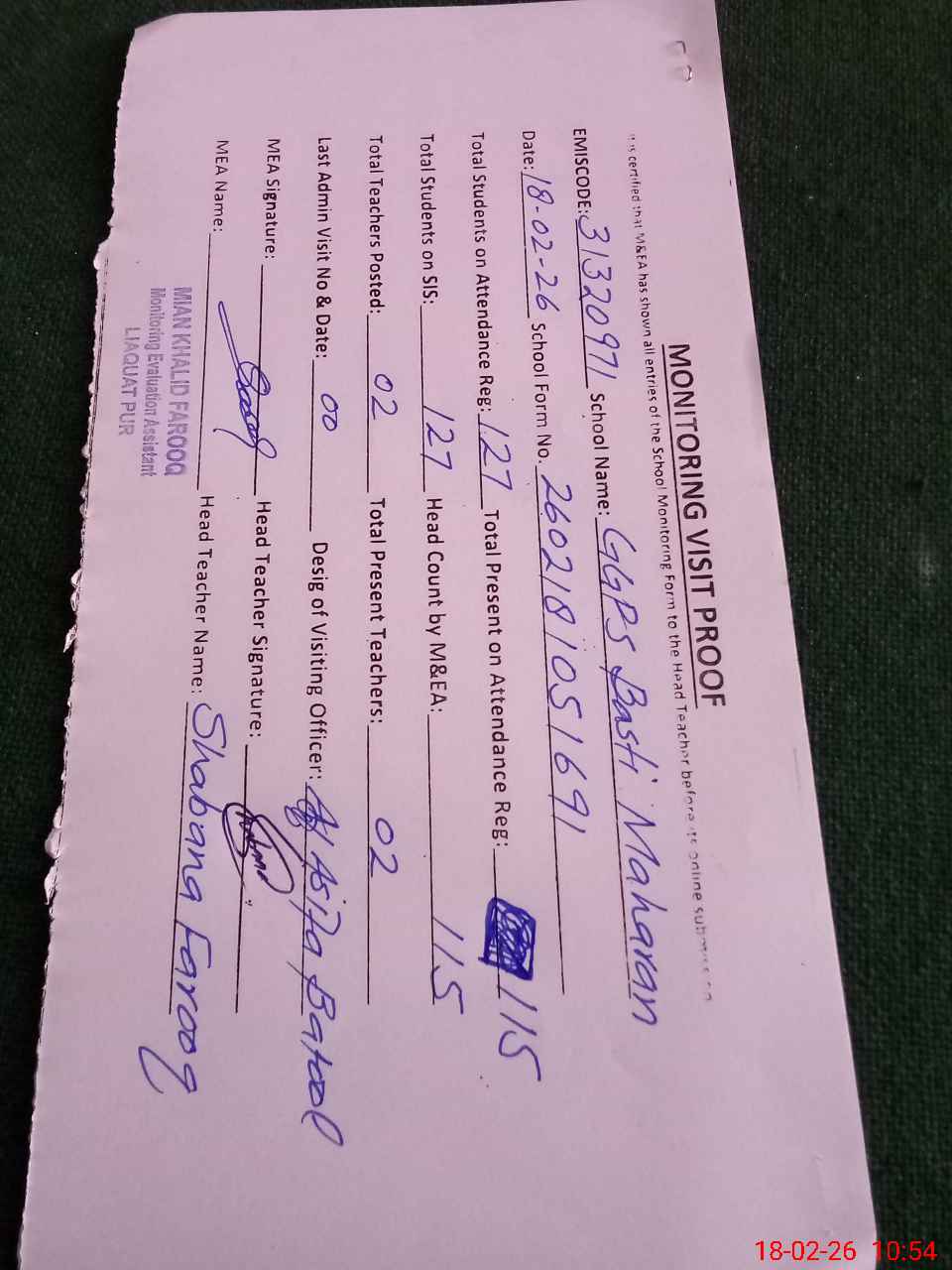 | Attendance Register | Head Teacher | MEA with School | Visit Proof |