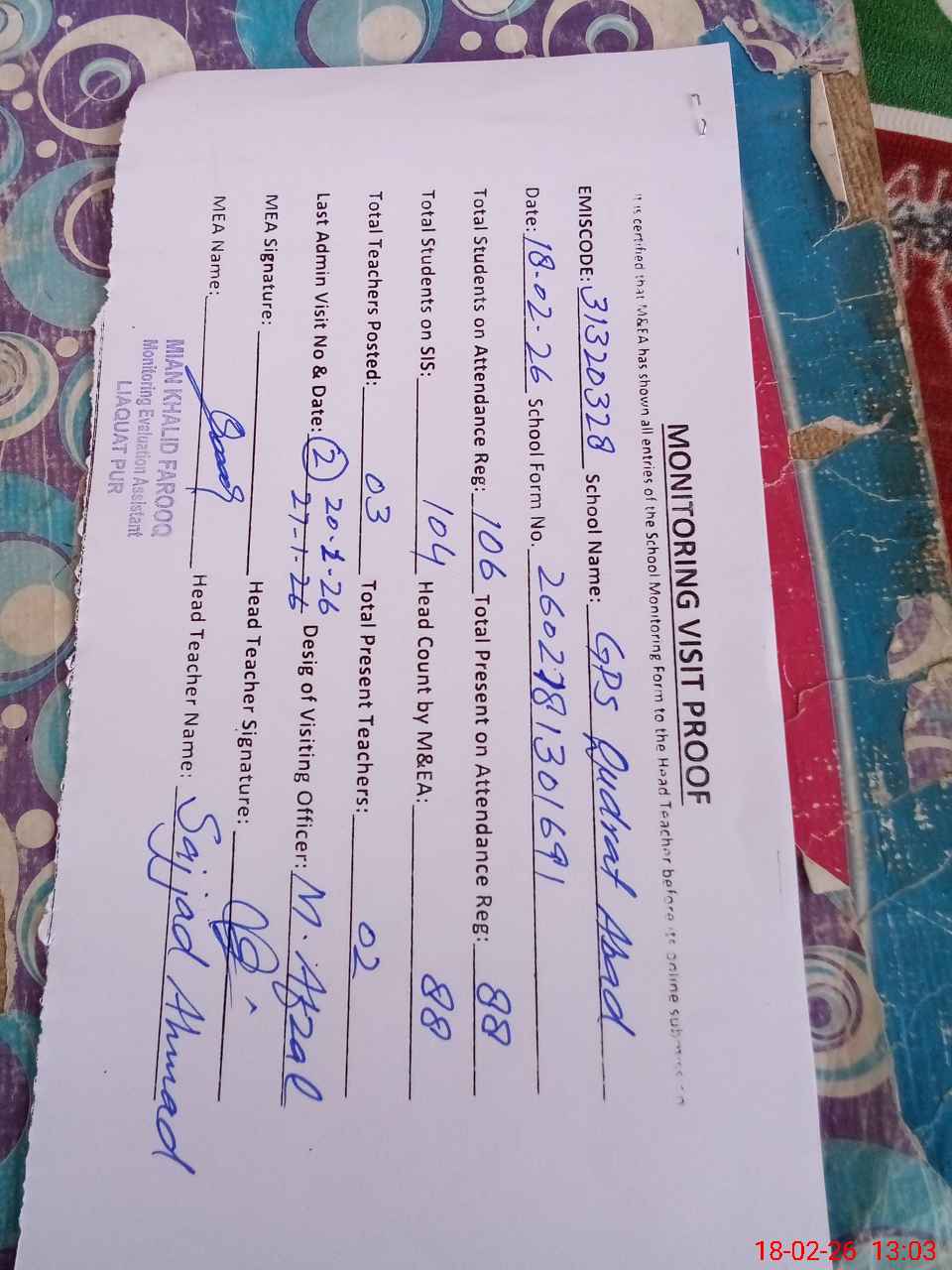 | Attendance Register | Head Teacher | MEA with School | Visit Proof |