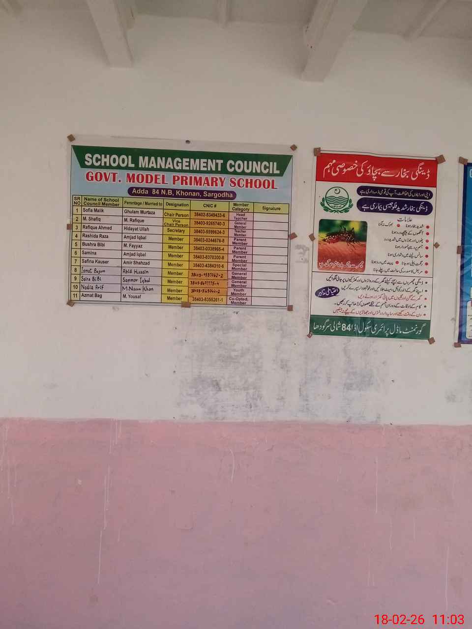 | District: SARGODHA | Tehsil: SARGODHA | Markaz: CHAK 84-NB - FEMALE | Level: Primary | |