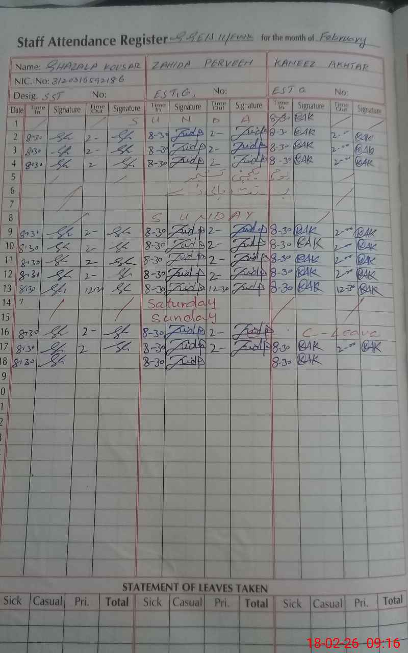 | CNIC | Full Name | Designation | R/C | Absence During Last Calender Month |
