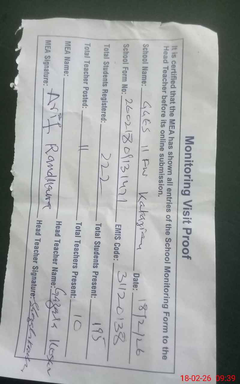 | EMIS Code: 31120138 | Name of School: GGES CHAK NO. 11/FW KATARIAN | |||