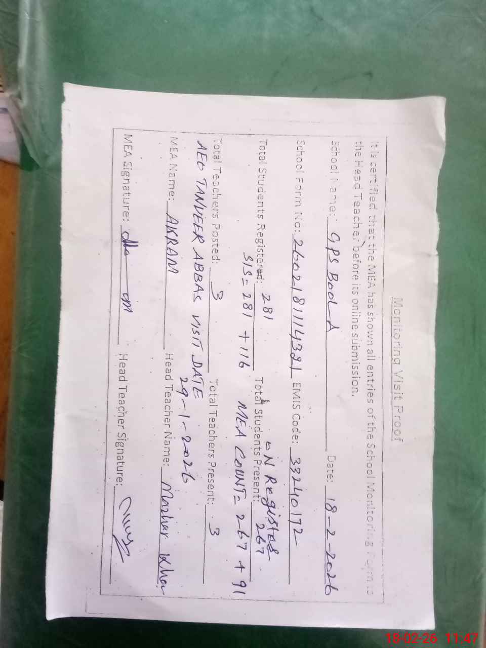 | Attendance Register | Head Teacher | MEA with School | Visit Proof |
