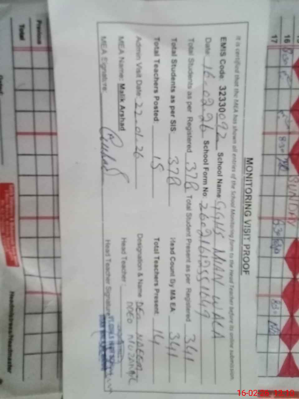 | EMIS Code: 32330092 | Name of School: GGHS MIAN WALA | |||