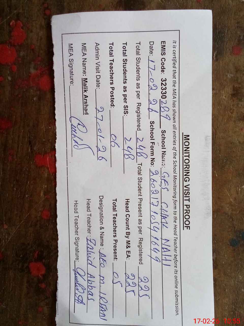 | Attendance Register | Head Teacher | MEA with School | Visit Proof |