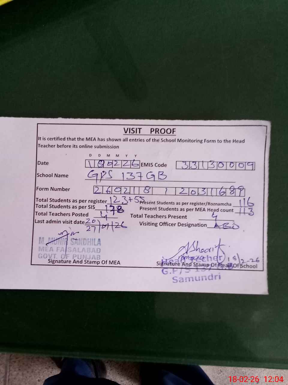 | Attendance Register | Head Teacher | MEA with School | Visit Proof |