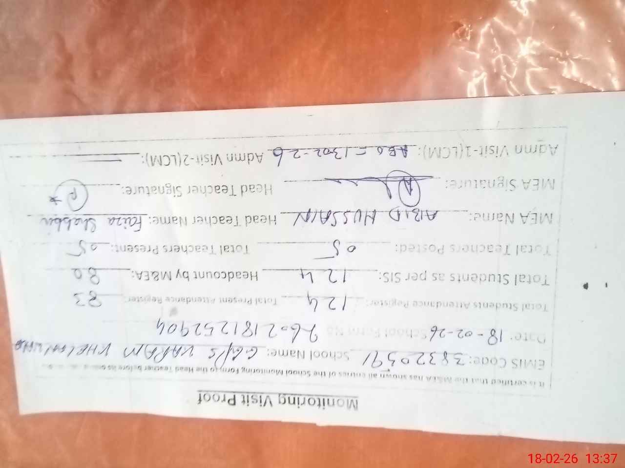 | Attendance Register | Head Teacher | MEA with School | Visit Proof |