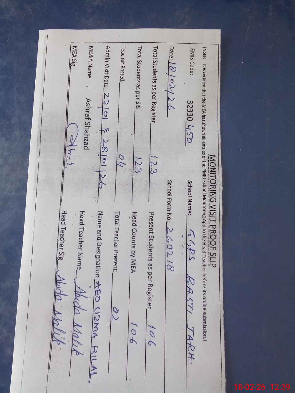| Attendance Register | Head Teacher | MEA with School | Visit Proof |