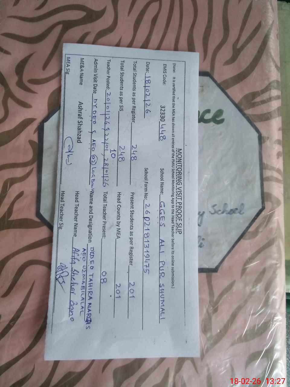 | EMIS Code: 32330448 | Name of School: GGES ALI PUR SHUMALI | |||