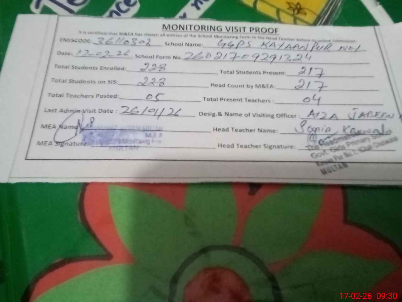 | Attendance Register | Head Teacher | MEA with School | Visit Proof |