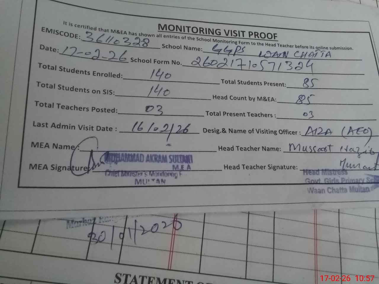 | EMIS Code: 36110328 | Name of School: GGPS WAN CHATTA BAHAWALPUR ROAD MULTAN | |||