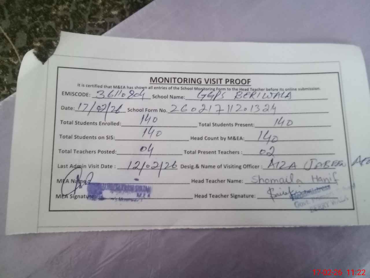 | Attendance Register | Head Teacher | MEA with School | Visit Proof |