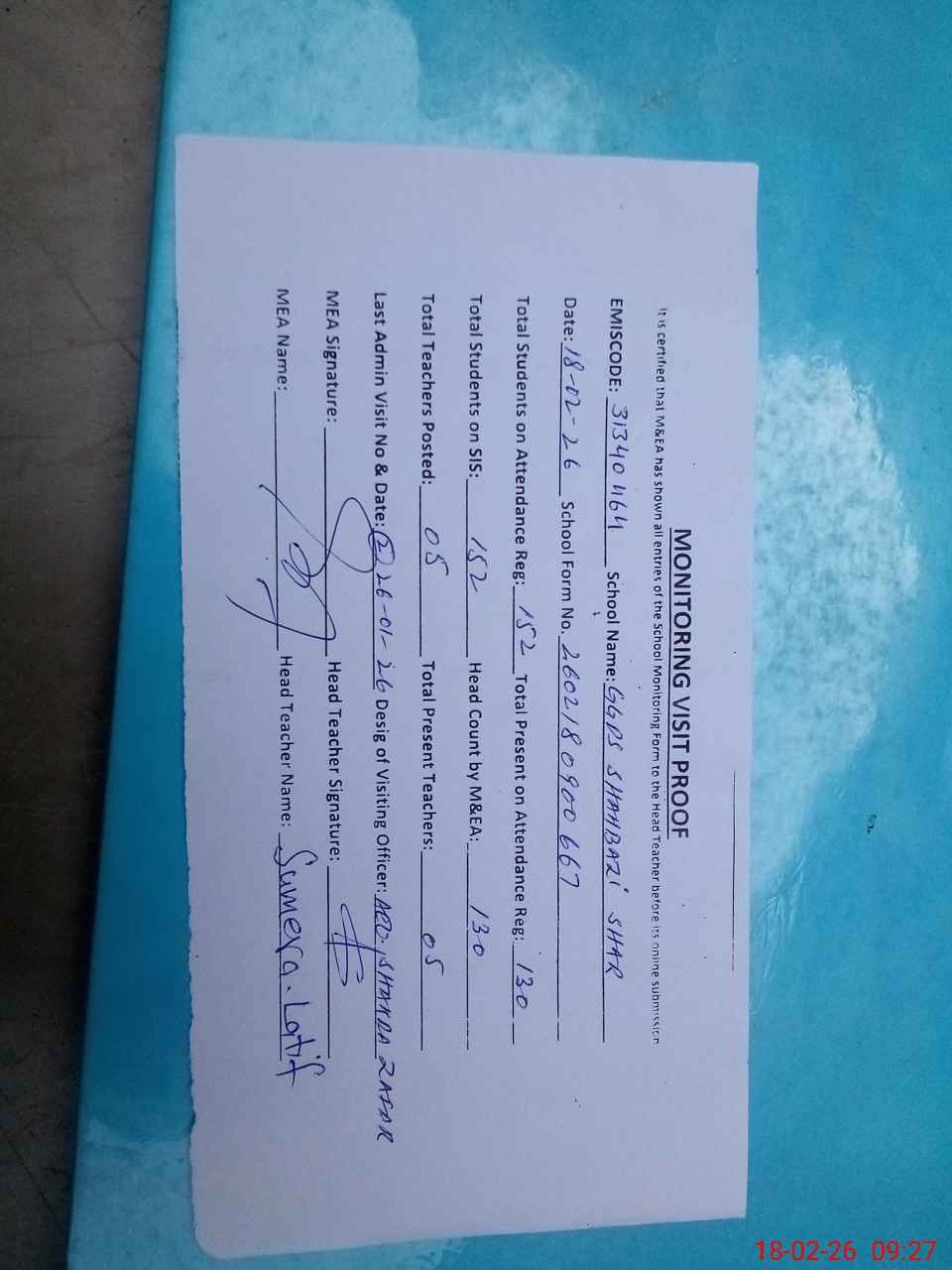 | Attendance Register | Head Teacher | MEA with School | Visit Proof |