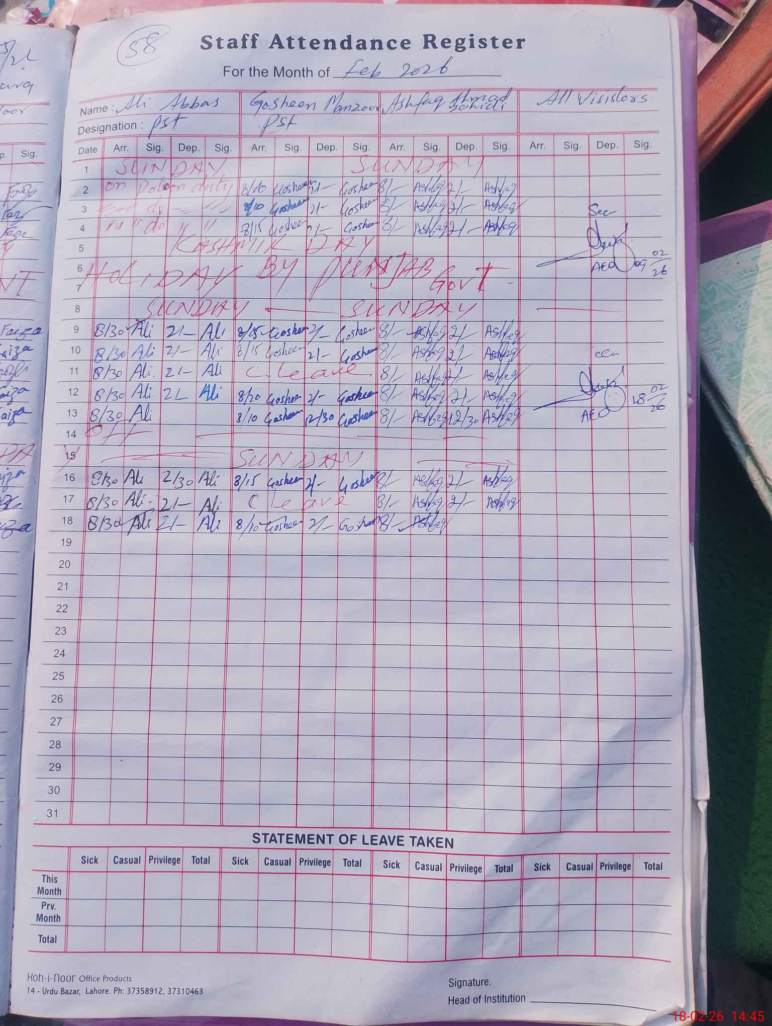 | Attendance Register | Head Teacher | MEA with School | Visit Proof |