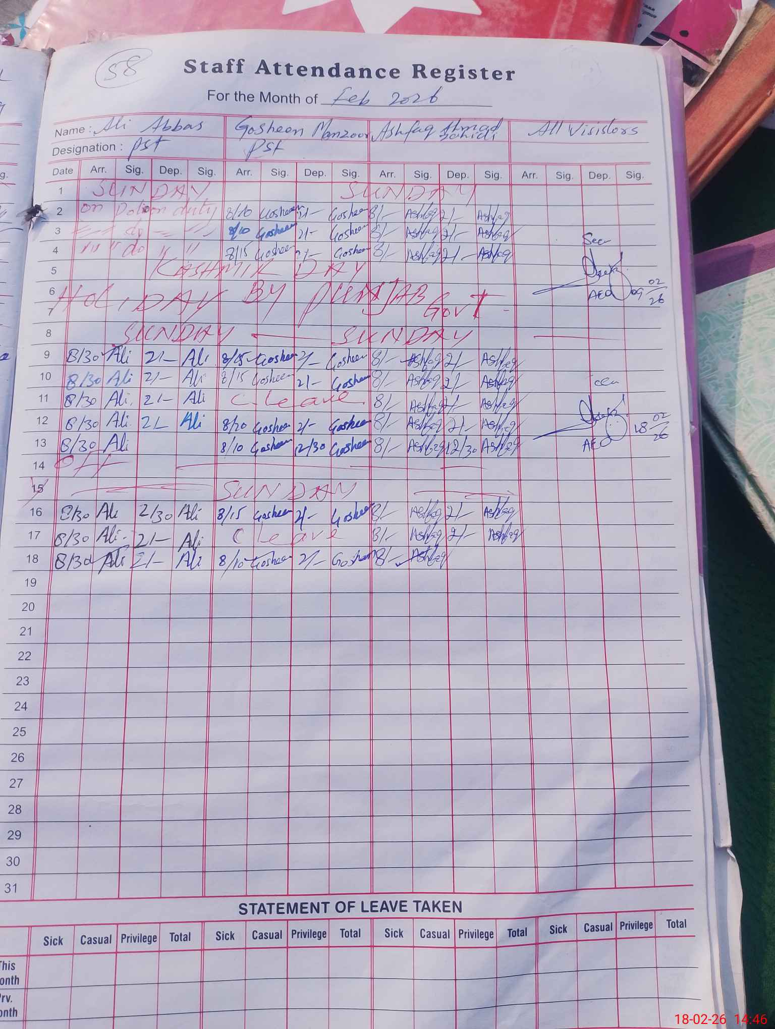 | Leave | Duty | Absent | Maternity | Medical | Ex- Pak |