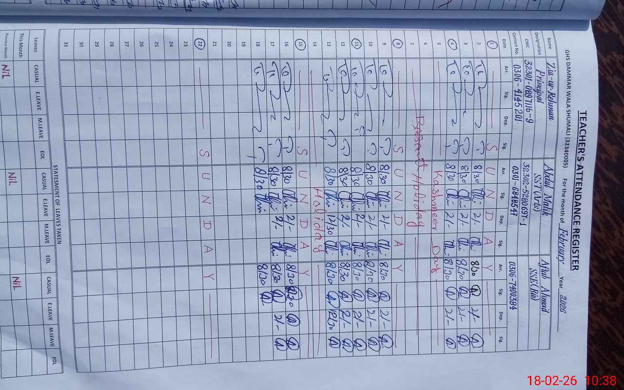 | Name: Zi**** UrRe**** Designation: (School Headmaster's/Headmistress's) Principal Phone/Cell Number: 03**** |