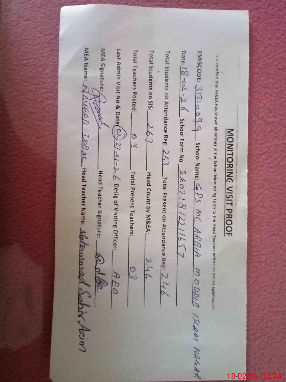 | Attendance Register | Head Teacher | MEA with School | Visit Proof |