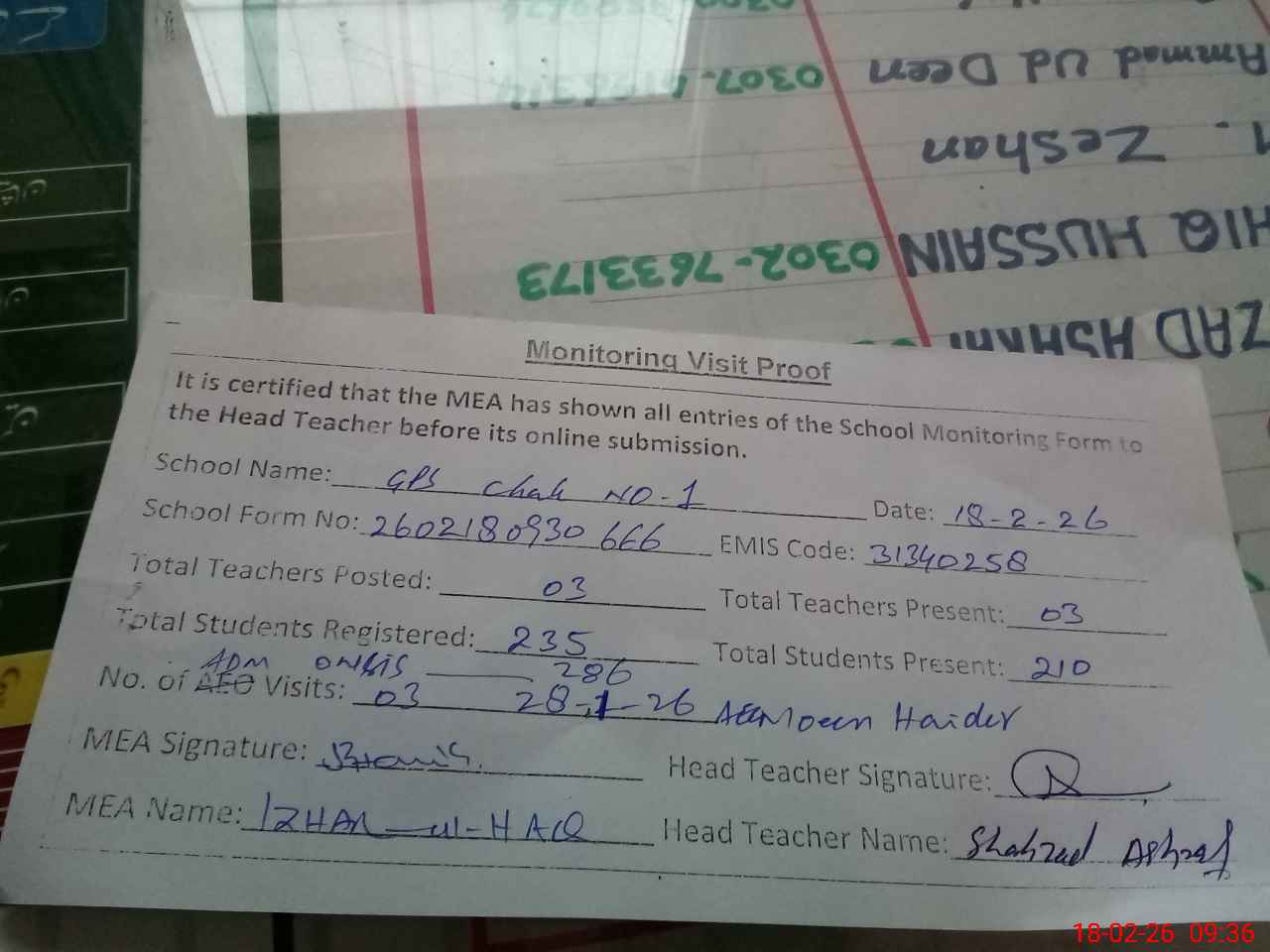 | EMIS Code: 31340258 | Name of School: GPS CHAK NO 1/NP | |||