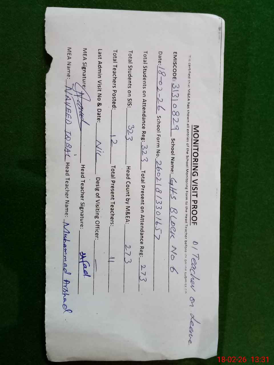| EMIS Code: 31310829 | Name of School: GHS BLOCK NO. 6 KHANPUR | |||
