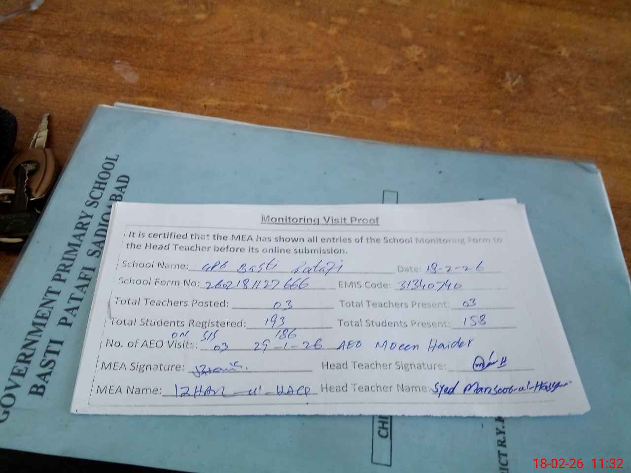 | Attendance Register | Head Teacher | MEA with School | Visit Proof |