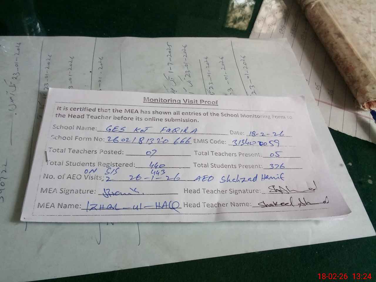 | Attendance Register | Head Teacher | MEA with School | Visit Proof |