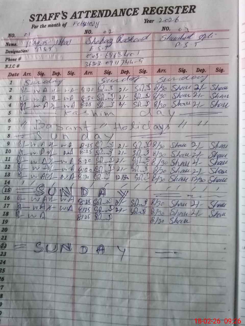 | CNIC | Full Name | Designation | R/C | Absence During Last Calender Month |