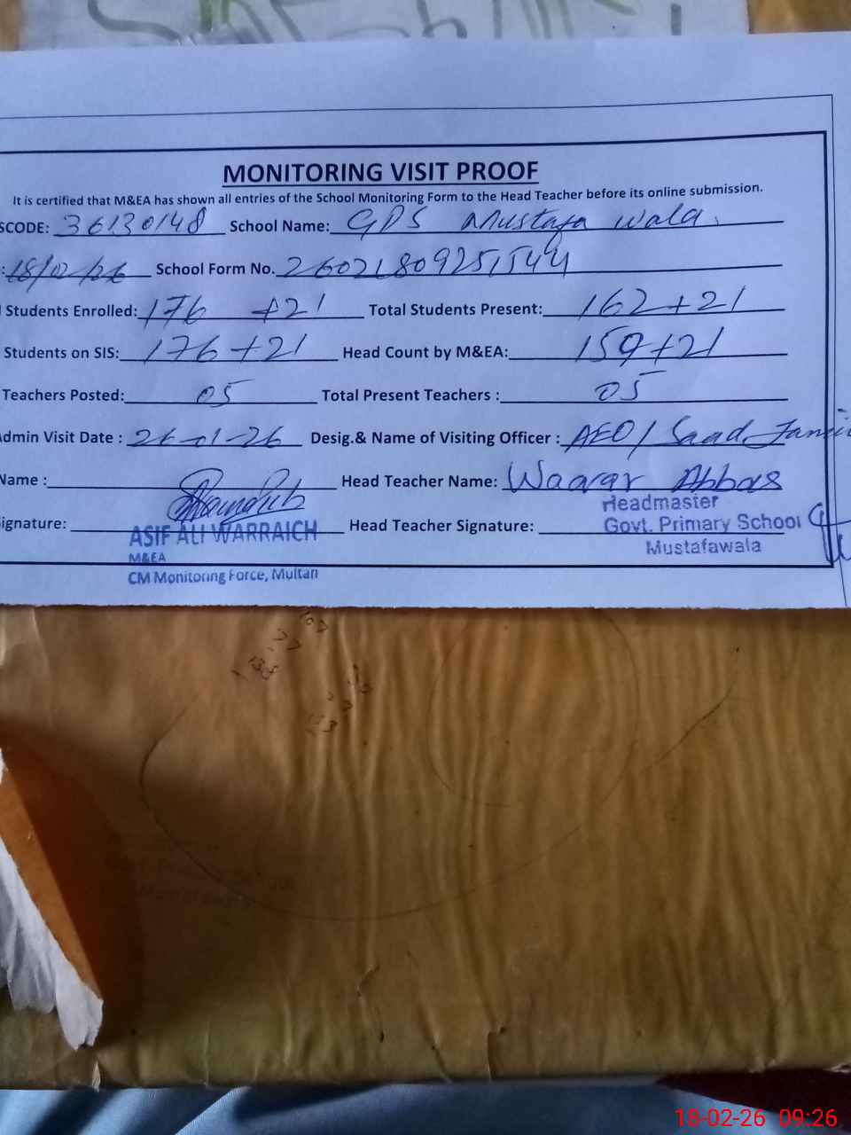 | Attendance Register | Head Teacher | MEA with School | Visit Proof |