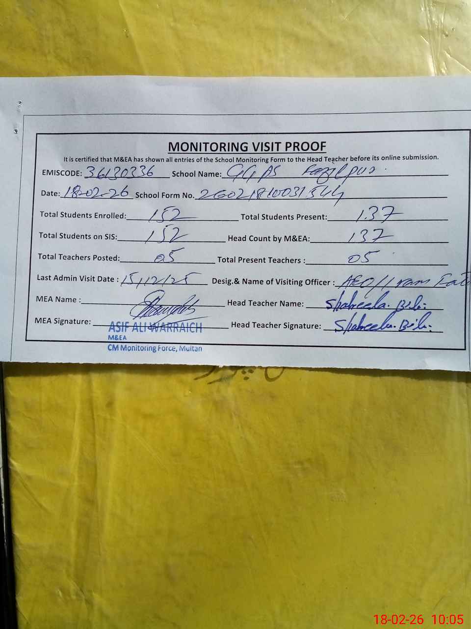 | Attendance Register | Head Teacher | MEA with School | Visit Proof |