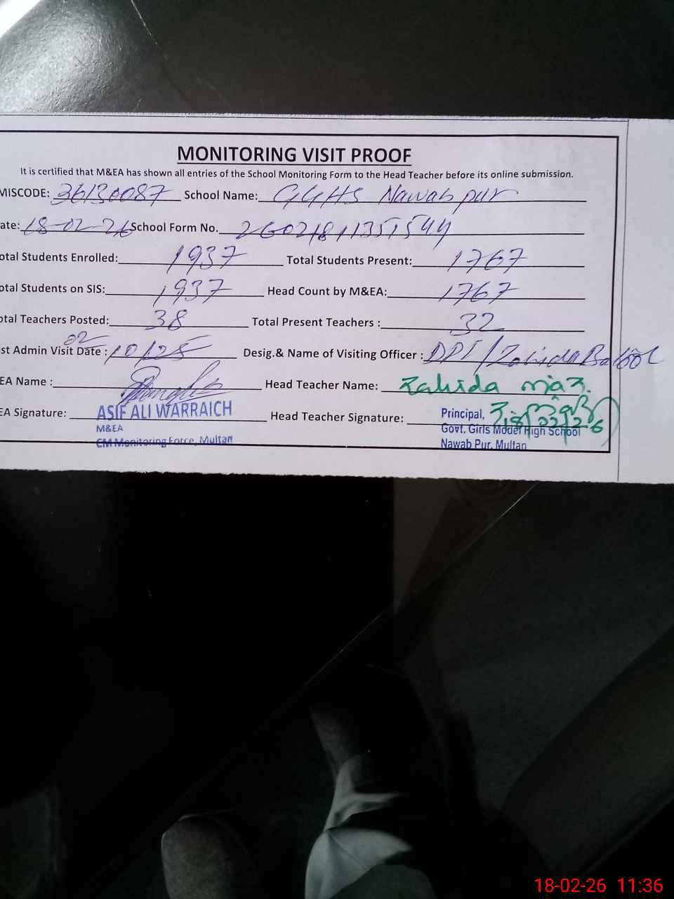 | EMIS Code: 36130087 | Name of School: GGHS NAWAB PUR P/O NAWABAB PUR | |||