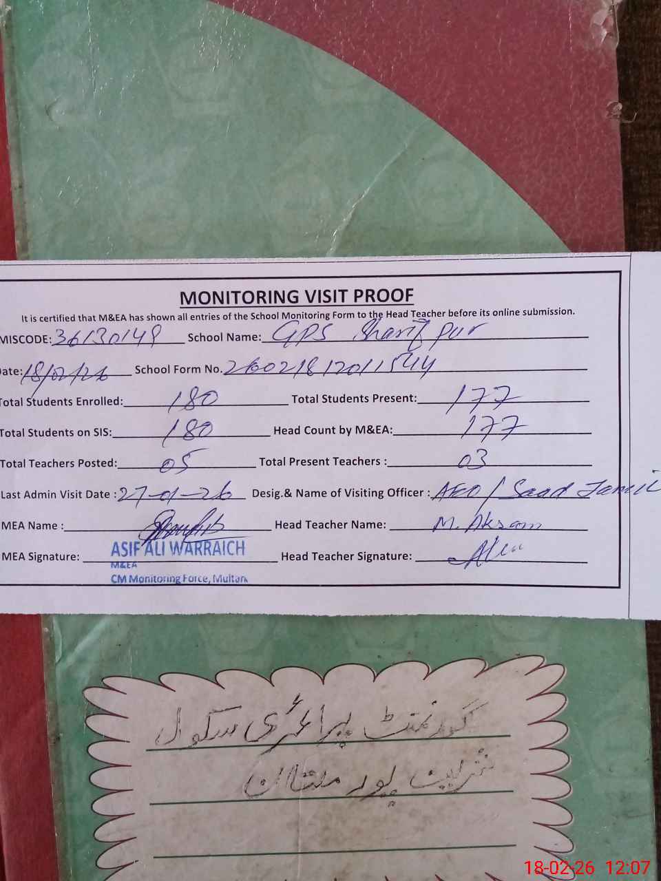 | EMIS Code: 36130149 | Name of School: GPS SHARIF PUR NAWAB PUR MULTAN | |||