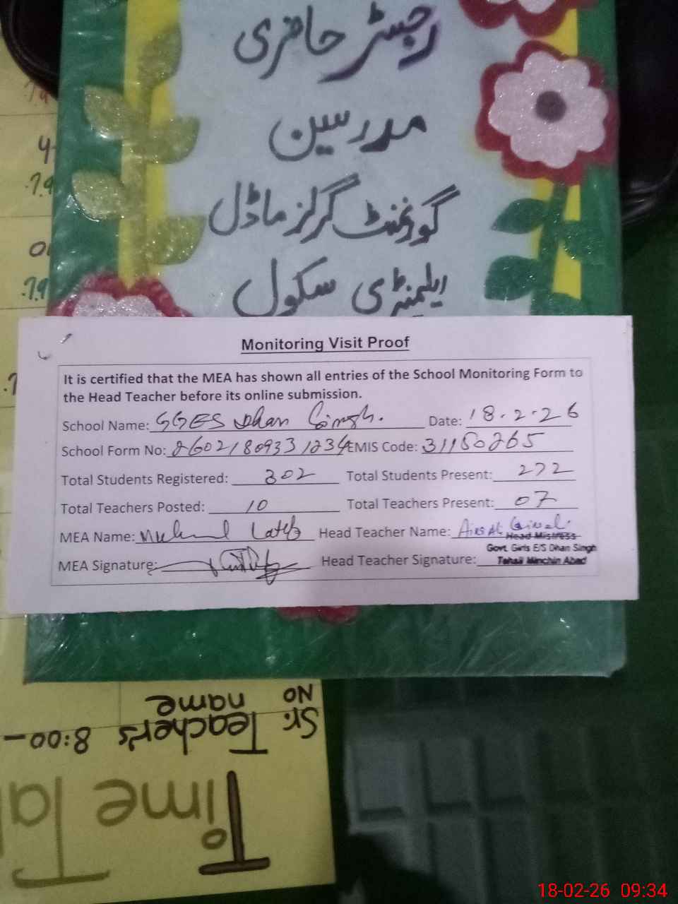 | Attendance Register | Head Teacher | MEA with School | Visit Proof |