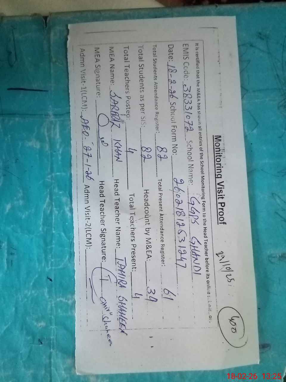 | Attendance Register | Head Teacher | MEA with School | Visit Proof |
