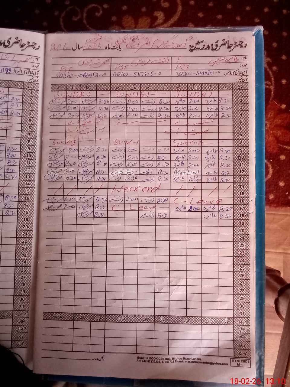 | CNIC | Full Name | Designation | R/C | Absence During Last Calender Month |