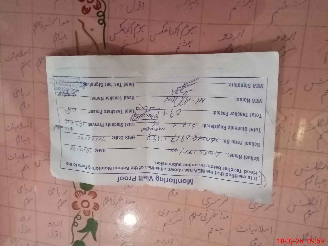 | Remarks (Use Separate Page if Required): free text books record not shown to mea and NSB RECORD REGISTER NOT MAINTAINED and there is no approved leave of teacher Maqboola bibi on sis or hrm from 16 Feb 2026 to 11 March 2026 and C IV Muhammd Nadeem IS ON INRNAL DUTY HERE AND HE IS PRESENT | |||||