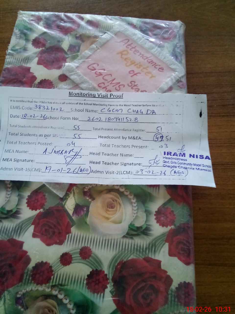 | Attendance Register | Head Teacher | MEA with School | Visit Proof |