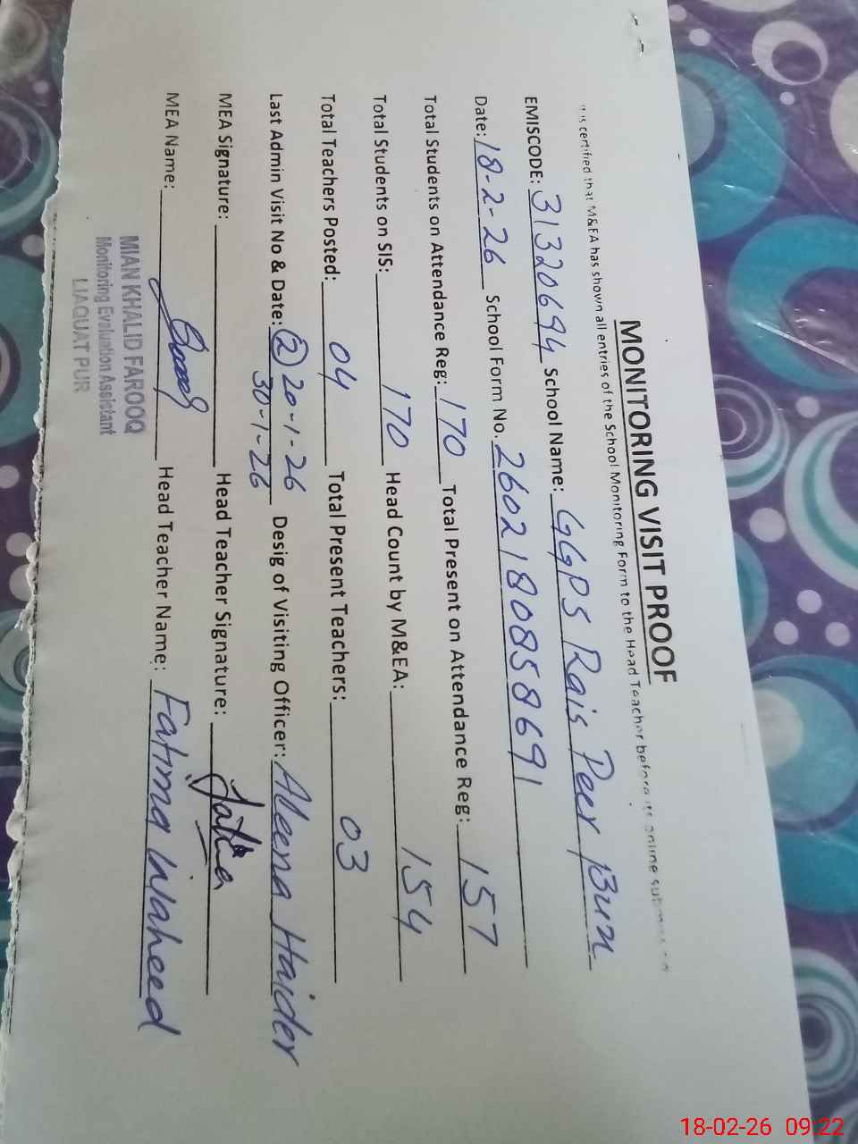 | Monitoring Date: 18-02-2026 | Start Time: 18-02-2026 08:52 AM | End Time: 18-02-2026 09:28 AM | Name of MEA: Kh**** Fa**** | |