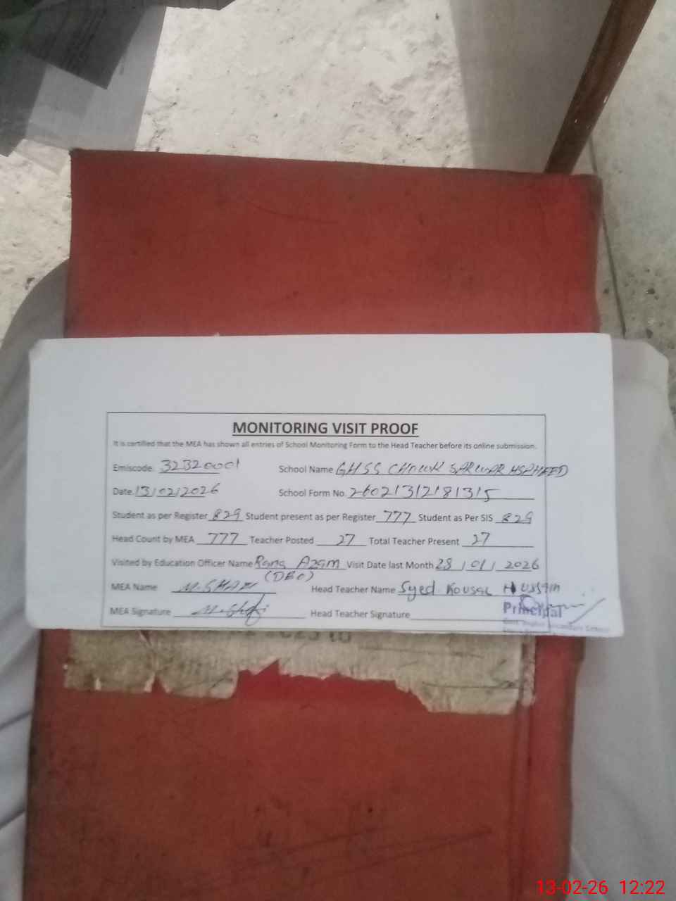 | Attendance Register | Head Teacher | MEA with School | Visit Proof |