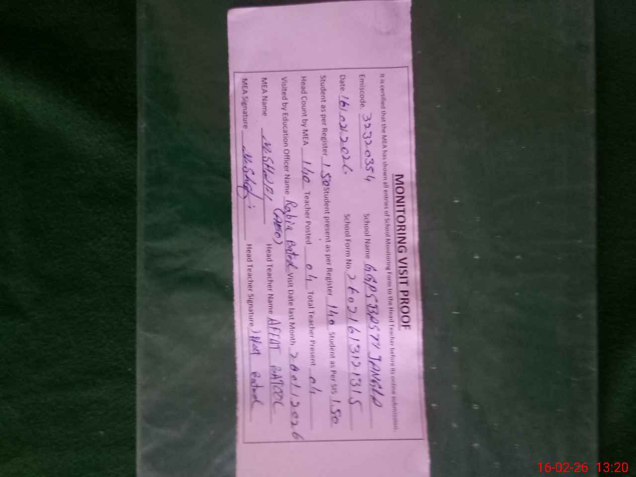 | Attendance Register | Head Teacher | MEA with School | Visit Proof |