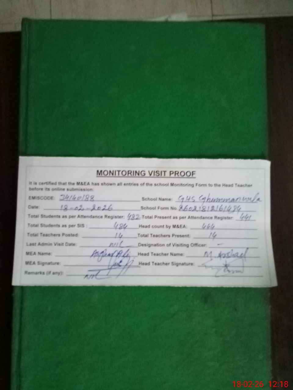 | Attendance Register | Head Teacher | MEA with School | Visit Proof |