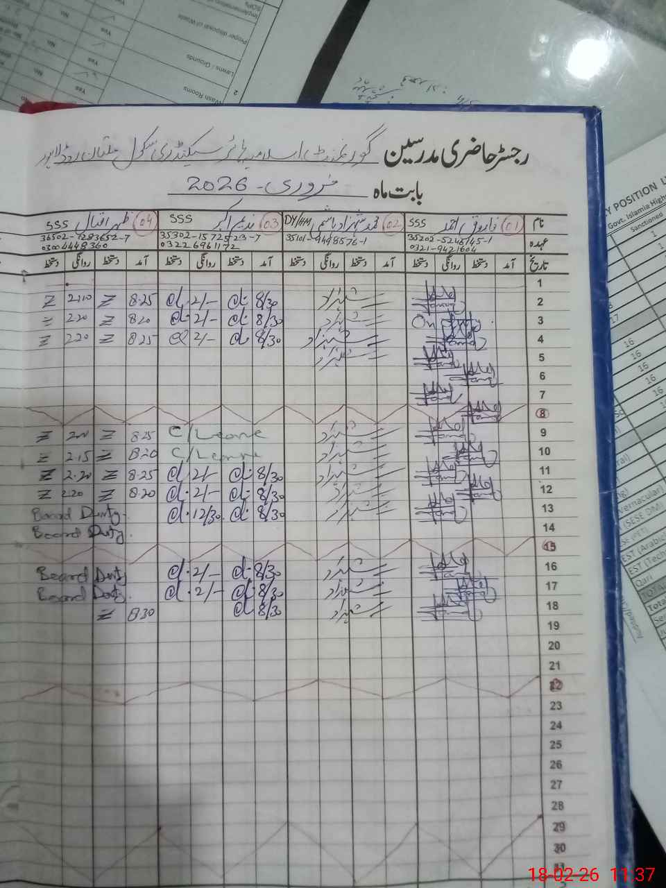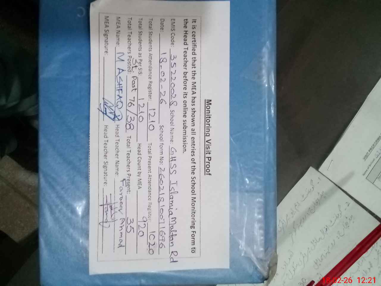 | Remarks (Use Separate Page if Required): DEO Muhammad Arif visited on 22-11-25 DDEO visited on 21-11-25 Dy Secretary Dr Arif Asadullah visited on 20-11-25 EST Umair Zahid long absent since 22-01-2025 Total present students strength is 920 out 1210 but on Roznamcha present strength is 1020 students, here difference is 100 students Paint work required for whole the school building 35220028 | |||||
