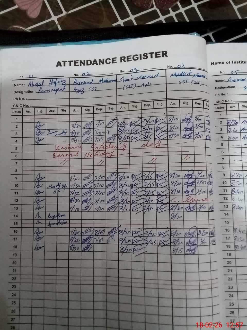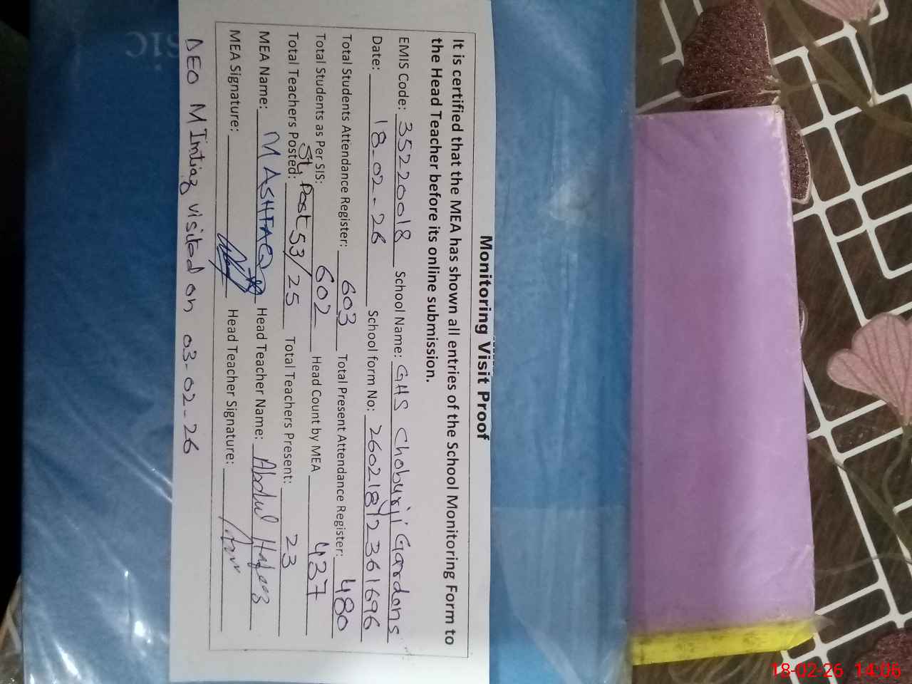 | Remarks (Use Separate Page if Required): EST Shahnaz Akhter surrender on 12-12-2025 further her name may please be deleted from SIS DEO Muhammad Imtiaz visited on 03-02-2026 School has total 25 toilets while 06 toilets non functional due to sewerage system blocked School has total 50 rooms while 07 classrooms looking poor condition and not in use Free text books record not shown Total present strength of students is 437 out of 603 while on Roznamcha present strength is 480, here difference in 43 students 35220018 | |||||