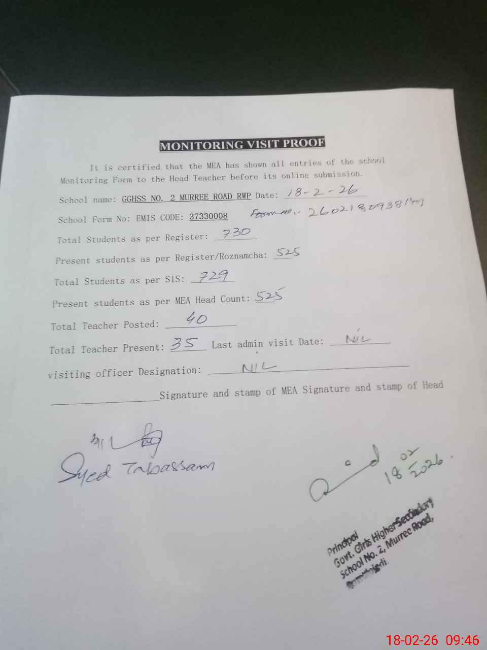 | EMIS Code: 37330008 | Name of School: GGHSS NO 2 MURREE ROAD RWP | |||