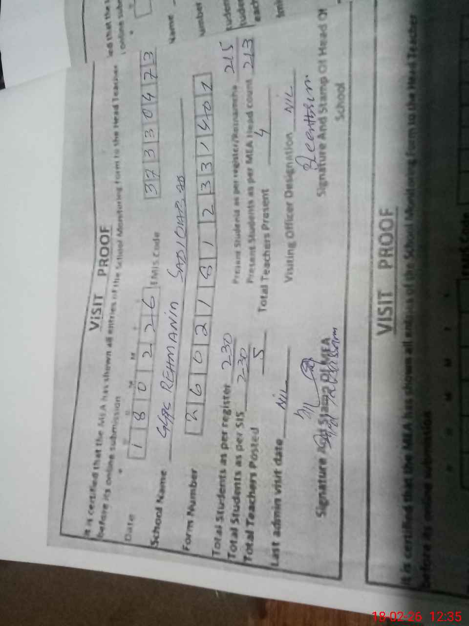 | Certified that this School was Inspected by the Undersigned MEA/DMO Today and the Information Stated Above is as Per Record. | |||||
