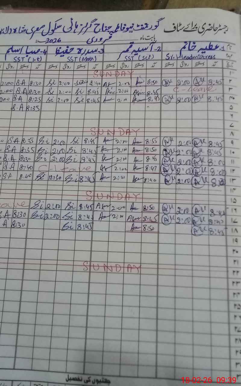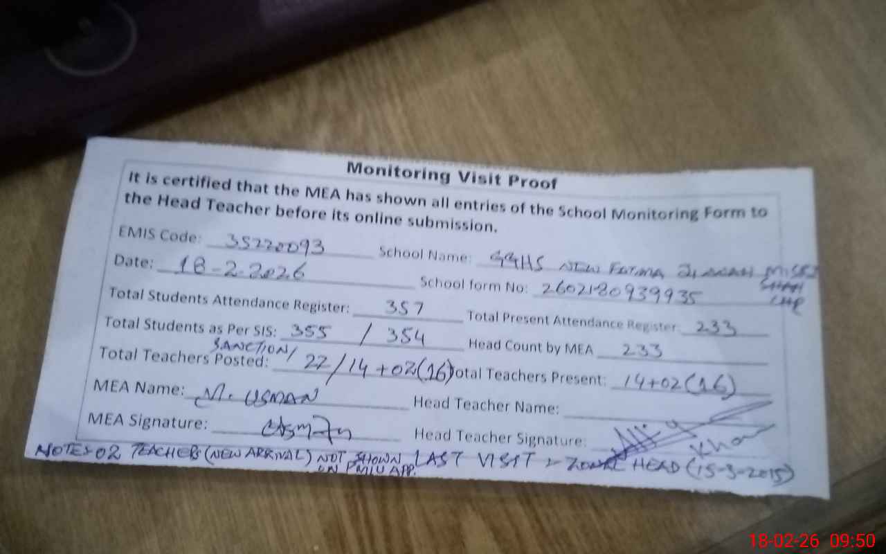 | Remarks (Use Separate Page if Required): 02 teachers named Shahnaz kausar and Shazia perveen both EST ( New Arrival ) not shown on PMIU APP, however both are showing on school TAB. Both Arrived on 16 February,2026. Maintenance work is required 01 class room is effective due to transformer burnt last three years ago. 02 wash rooms are nonfunctional due to blocked and door broken. switch board cover is open. | |||||