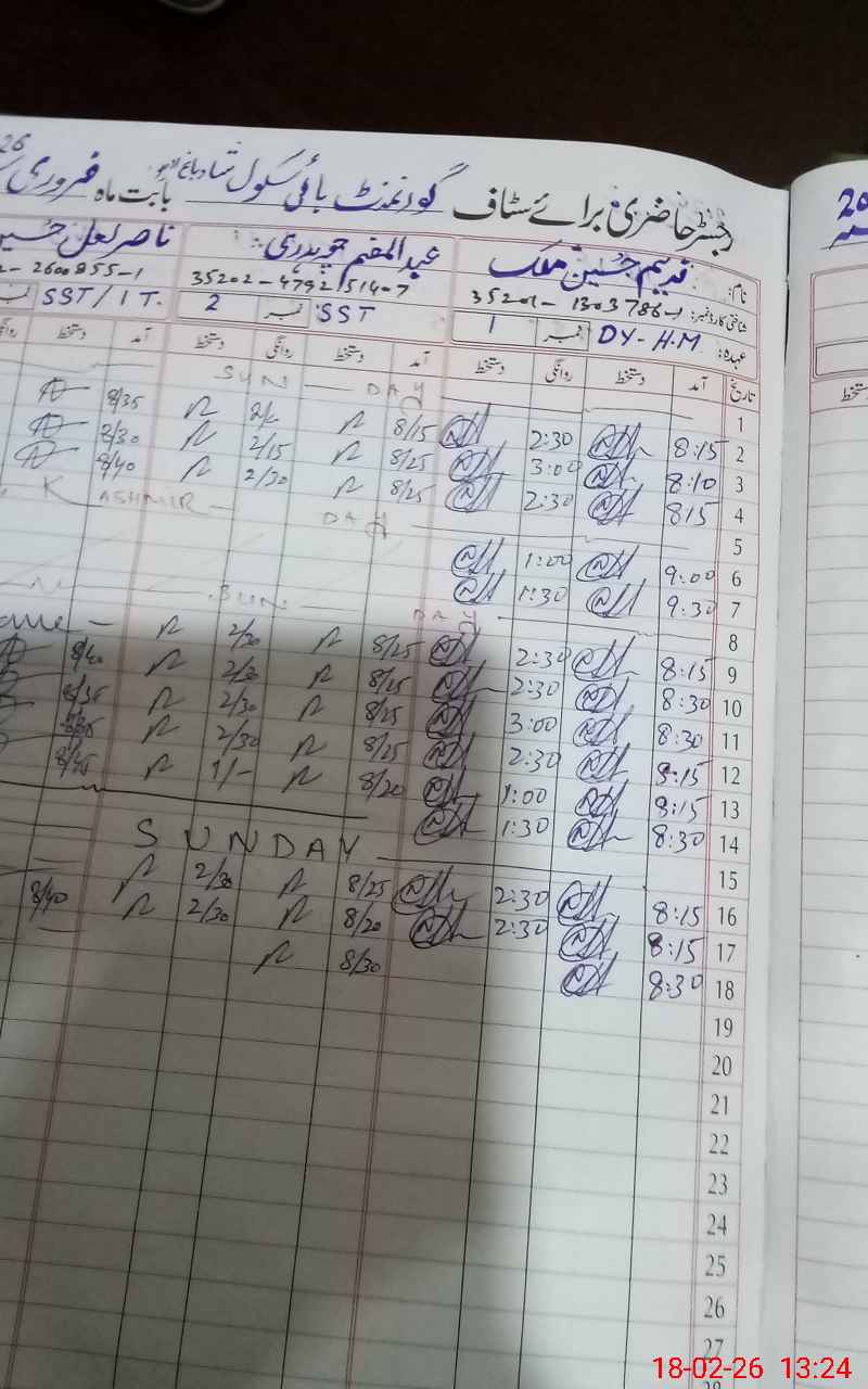 | Remarks (Use Separate Page if Required): 01 teacher named Nasir Lal Hussain marked absent due to leave record was not available JC marked absent due to Physically not present 02 nonteaching staff marked absent due to valid temporary duty letter was not available. 13 class rooms are looking dangerous since 30June, 2025, Head of the school raised number of applications to higher authorities but still building department is not visited the school. 06 class rooms are under construction since 2014 and stoped work in 2016. 24 class rooms which are using also not completed and not handed over. These rooms are partially completed since 2005. | |||||