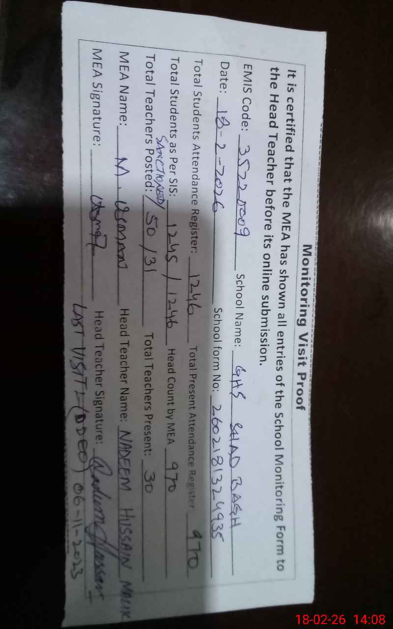 | EMIS Code: 35220009 | Name of School: GHS SHAD BAGH | |||