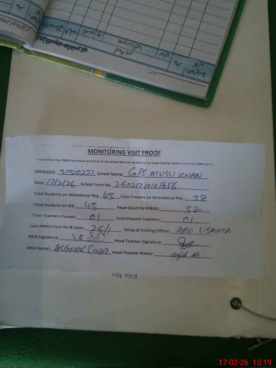 | Attendance Register | Head Teacher | MEA with School | Visit Proof |